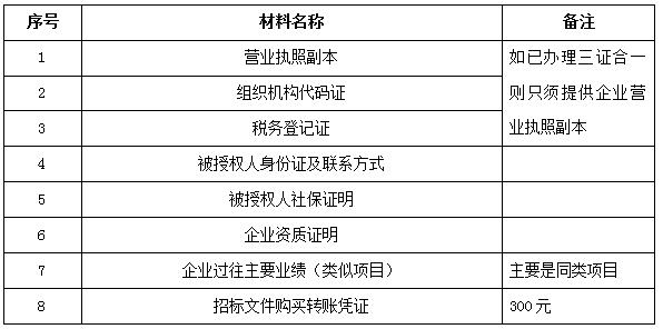 2、 凡有意向参加投标者,请在上述期间内按下表提供报名资料,相关证明文件的原件如无法提供原件则提供复印件加盖公司公章,投标人须将上述资料的扫描件发邮件至招标联系人处进行报名。